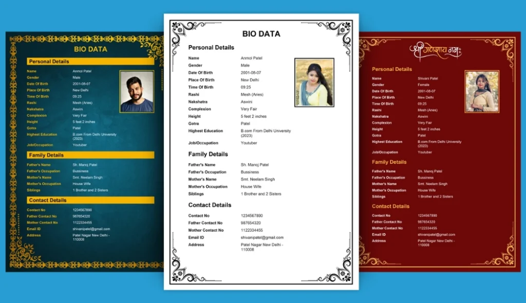 Design your perfect bio data for marriage with our intuitive tools. Whether you’re traditional or modern, our biodata formats help you stand out.