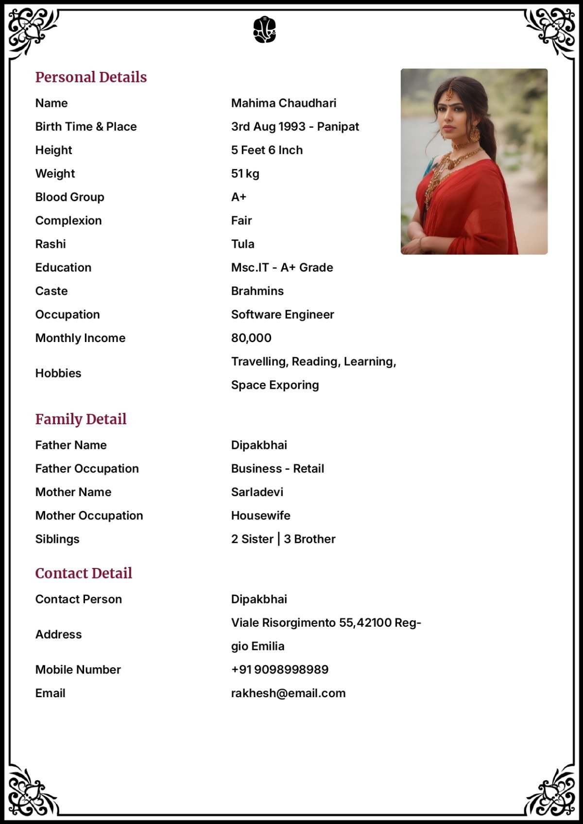 A biodata should not look like a job résumé. Choose clean designs with subtle colour palettes like pastel shades, elegant borders, or floral themes that suit the tone of matrimony.